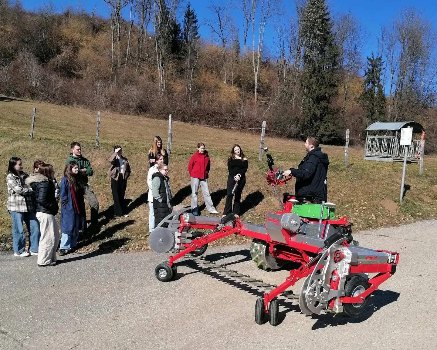 Am Nachmittag bot ein umfangreicher Stationenbetrieb Einblicke in die Praxis. Vertreten waren DeLaval, Lely und Smaxtec im Bereich Stalltechnik und Herdenmanagement. Der Maschinenring Kärnten demonstrierte eine Smartantenne für präzise Anwendungen im Feld. Die Firmen Blickwinkel und TerraInnovation präsentierten Lenksystem-Nachrüstlösungen, während die regionalen Landtechnikhändler Zankl und Stumpf moderne Techniklösungen vorstellten. Die Firma Rapid zeigte einen teilautonomen Motormäher.