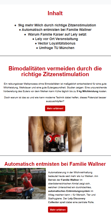Bleib am Ball und erfahre als Erster, was sich in Deinem Lely Center tut. Von innovativen Lösungen für den Stall bis zu exklusiven Aktionen und Veranstaltungen – unsere Lely News bringen Dir regelmäßig die wichtigsten Updates direkt ins Postfach.
