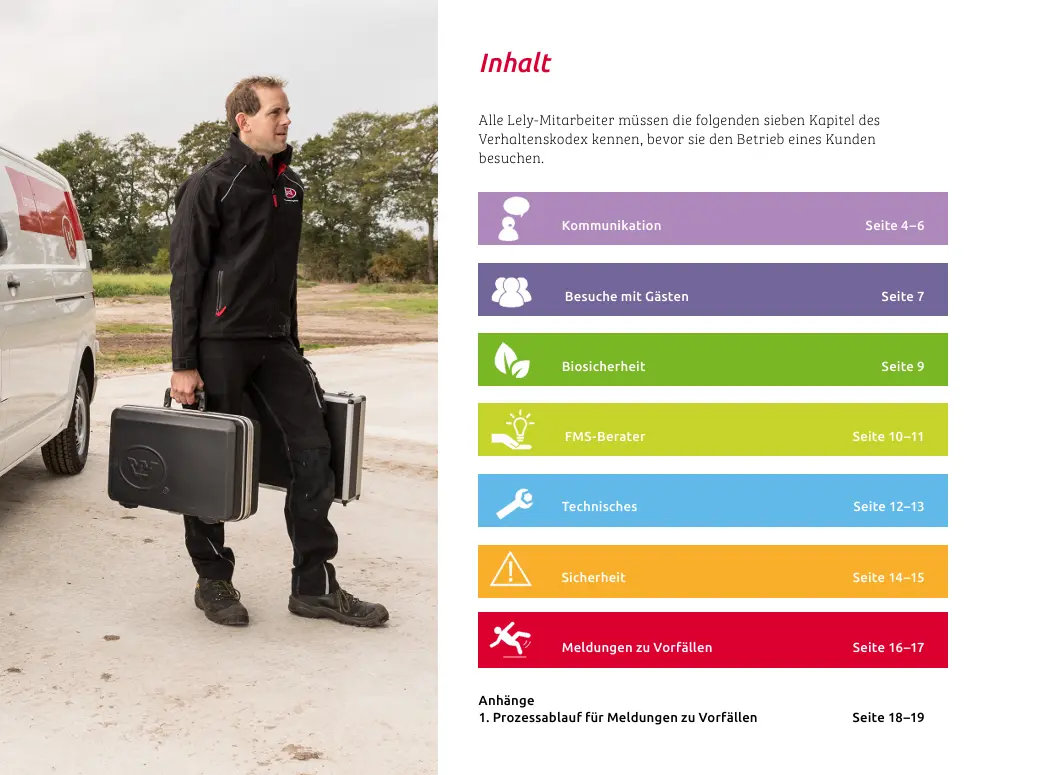 Alle Lely-Mitarbeiter müssen die mehrere Bereiche des Verhaltenskodex gelehrt werden, bevor du den Betrieb eines Kunden besuchst.